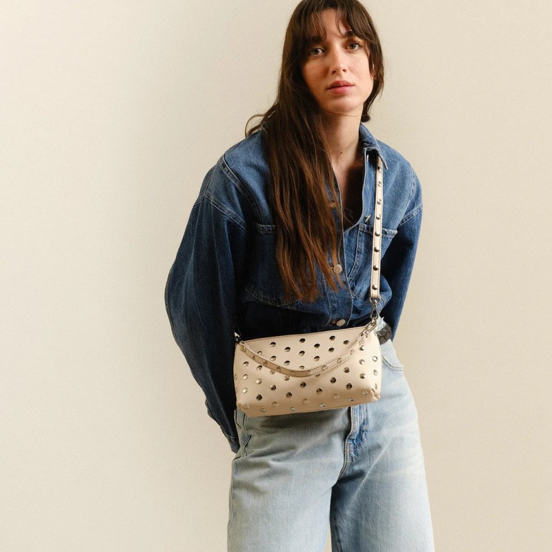Bolso en forma de baguette con remaches plateados y en color hueso.