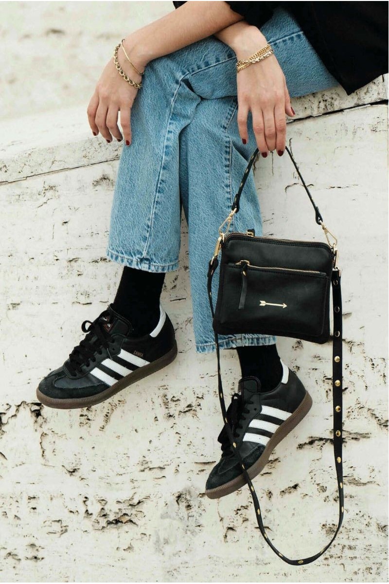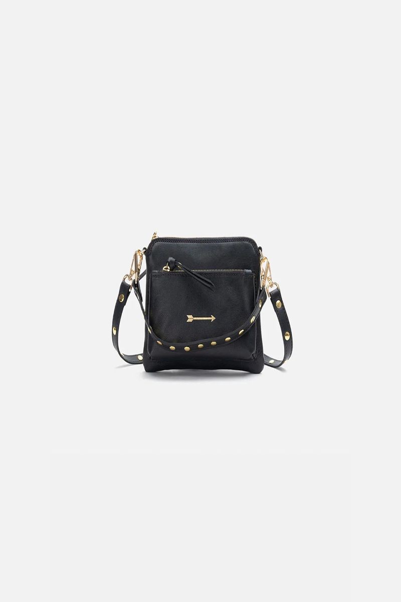 Este bolso de piel en color negro combina sofisticación y un toque atrevido gracias a su doble asa con tachuelas . Su acabado en forma de bandolera para llevarlo más cómodo, tiene un bolsillo exterior para guardar todo aquello que pequeño que quieras.