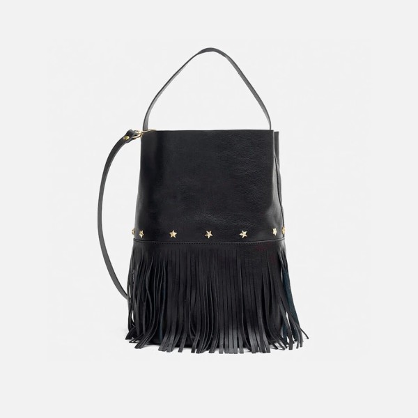 El Bucket Fringes es un bolso ligero con gran capacidad; cuenta con 2 asas, una fija superior para llevar al hombro o en la mano y una más larga para poder llevarlo colgado o cruzado.