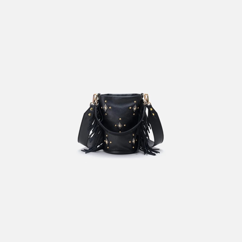 Bolso pequeño de piel con doble asa, flecos en los laterales y tachuelas decorativas en el frente. Es un bolso ligero y muy versátil, perfecto para el día o la noche.
