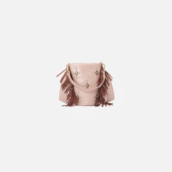 Bolso pequeño de piel con doble asa, flecos en los laterales y tachuelas decorativas en el frente. Es un bolso ligero y muy versátil, perfecto para el día o la noche.