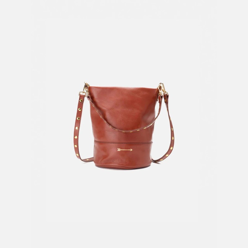 Bolso cubo mediano de piel con dos asas desmontables con remaches: una corta para llevarlo al hombro o en la mano y otra larga para llevarlo como bandolera.
