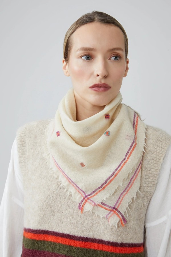 El pañuelo Chelsea N°815 celebra el arte del tejido tradicional con sus pequeños motivos en forma de banderas, hechos a mano según la técnica ancestral india del jamdani. Ligero y fluido, evoca la elegancia atemporal de un clan unido por sus símbolos, mezclando herencia artesanal y modernidad con una delicadeza singular