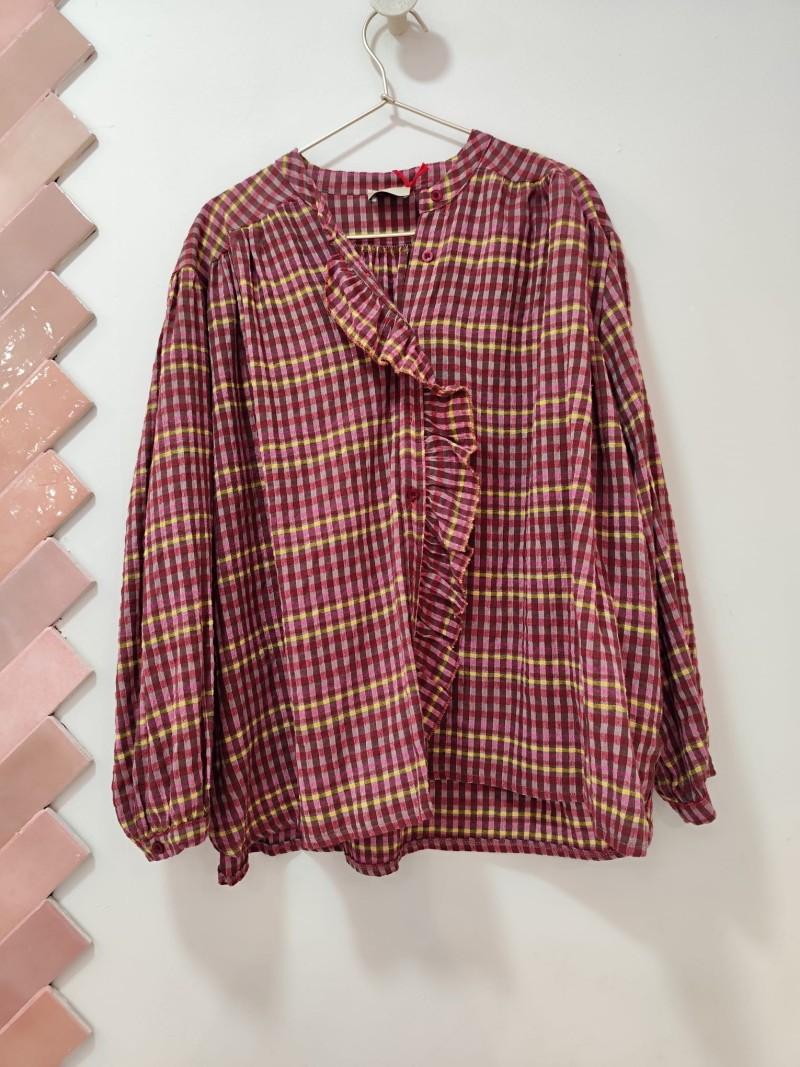 Camisa efecto arrugado, de cuadros en tonos magenta y amarillo, con volantes.